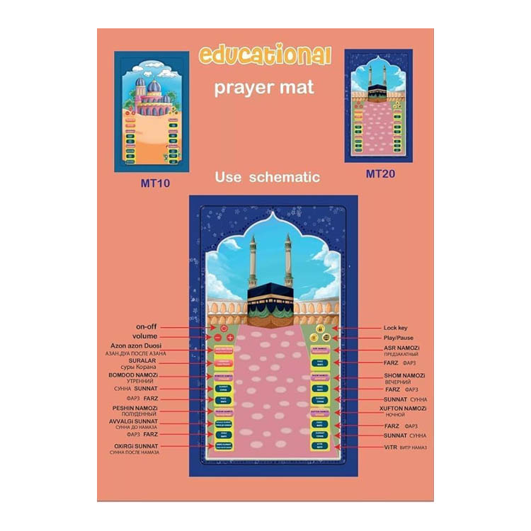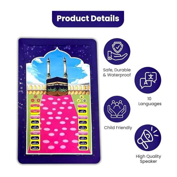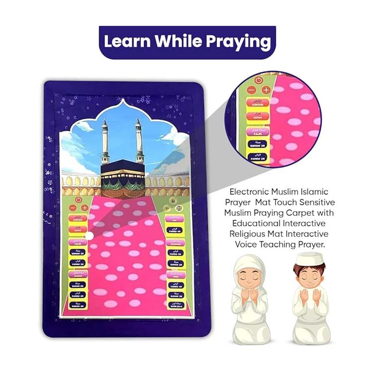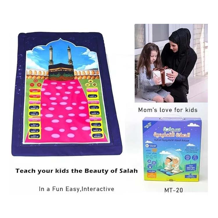 Diverse Language Assistance: Our electric Islamic prayer mat aids children in prayer with recitation options in 10 languages, fostering cultural connection and language exploration, Simple Navigation: Our mat’s user-friendly interface allows children to effortlessly switch languages with intuitive controls, promoting ease of use and exploration, Beyond prayer, the mat offers an enriching educational experience, teaching children prayer pronunciation and meaning in diverse languages, enhancing Islamic understanding, Dynamic Learning: The mat engages children with audio prompts and visuals, fostering interactive education, strengthening faith, and language skills.