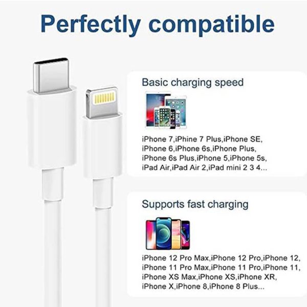 USB-C to Lightning cable: Rapidly charges iPhone 0 to 50% in 30 mins with 20W USB-C charger. 3x faster than 1A charger, supports 480Mbps data transfer. Ideal backup for iPhone, The newest Lightning-end design in the iPhone fast charger cable ensures swift and safe charging. With its original chip, it seamlessly connects to iOS devices, preventing any warning messages, The iPhone charging cable is built with top-grade materials, withstanding over 20,000 bends in lab tests. Its durable construction and heat-resistant original 8Pin connector ensure safety and reliability, Use this fast-charging lightning cable with a 20W USB-C cube charger plug for swift charging on various iPhone models (from iPhone 8 to iPhone 14) and iPad models (including iPad Pro and iPad Mini).